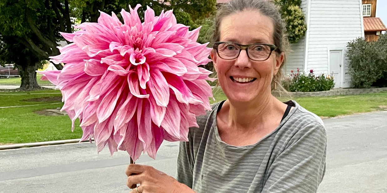 WHAT IS THE NAME OF THAT HUGE DAHLIA BLOOM YOU ARE HOLDING IN THIS PICTURE?